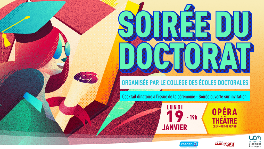 La Cérémonie de remise des écharpes doctorales de l’Université Clermont Auvergne, organisée par le Collège des Ecoles Doctorales en partenariat avec Clermont Auvergne Métropole, la ville de Clermont-Ferrand et la CASDEN se tiendra le lundi 19 janvier 2026 à 19h00 à l'opéra de Clermont-Ferrand. Les docteurs diplômés en 2025 des 5 Écoles Doctorales seront conviés, ainsi que leurs Directeurs de thèse et proches, et de nombreuses personnalités (officiels, entreprises) -